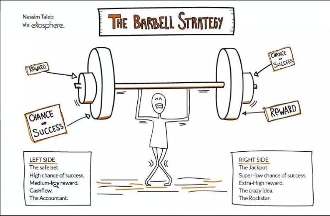 Manage resources using the "Barbell" strategy. On one side, we have high-risk products with a low chance of success but potentially significant returns. On the other end, we have service provision, which offers low risk and a high chance of success but with more modest rewards.